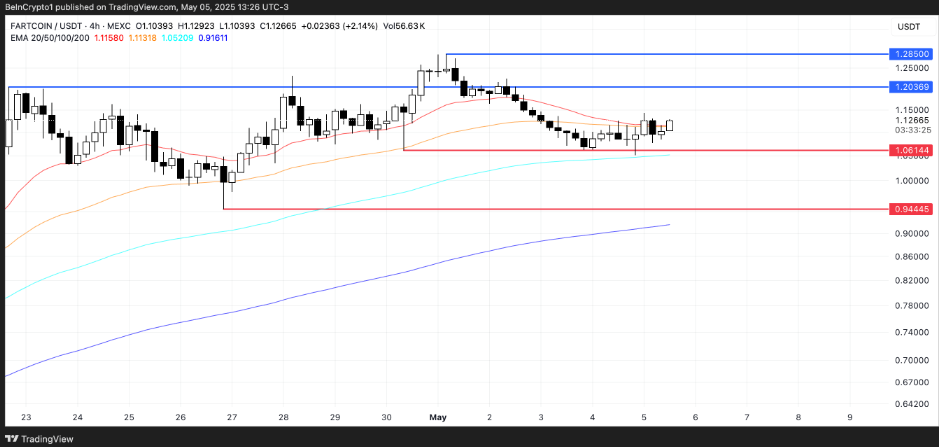FARTCOIN đang tiến gần đến vùng kháng cự quan trọng tại $1,20 và $1,28; nếu phe bò có thể vượt qua, một đợt tăng giá lên $1,60 sẽ diễn ra sau đó.