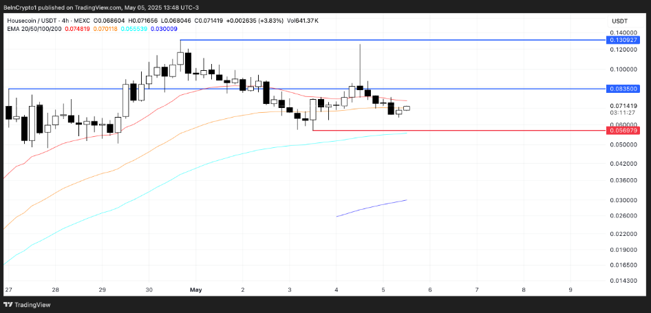Nhìn về phía trước, HOUSE đang tiến gần đến mức hỗ trợ chính quanh $0,0569. Nếu giữ được vùng này, một đợt phục hồi có thể đưa nó lên $0,0835 và thậm chí có thể cán mốc $0,13.