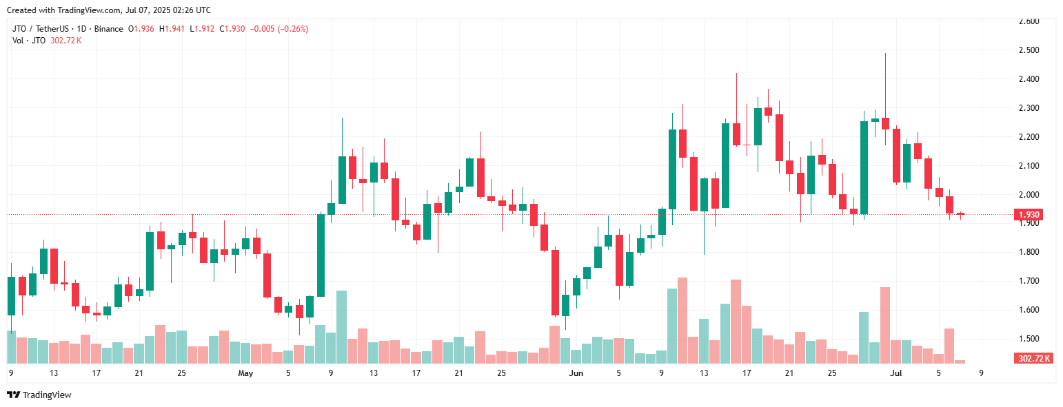 Nếu giá rơi xuống dưới 1,8 đô la, JTO sẽ ghi nhận mức đóng thấp nhất trong tháng, đồng thời có thể phát tín hiệu yếu kém trong cấu trúc thị trường.