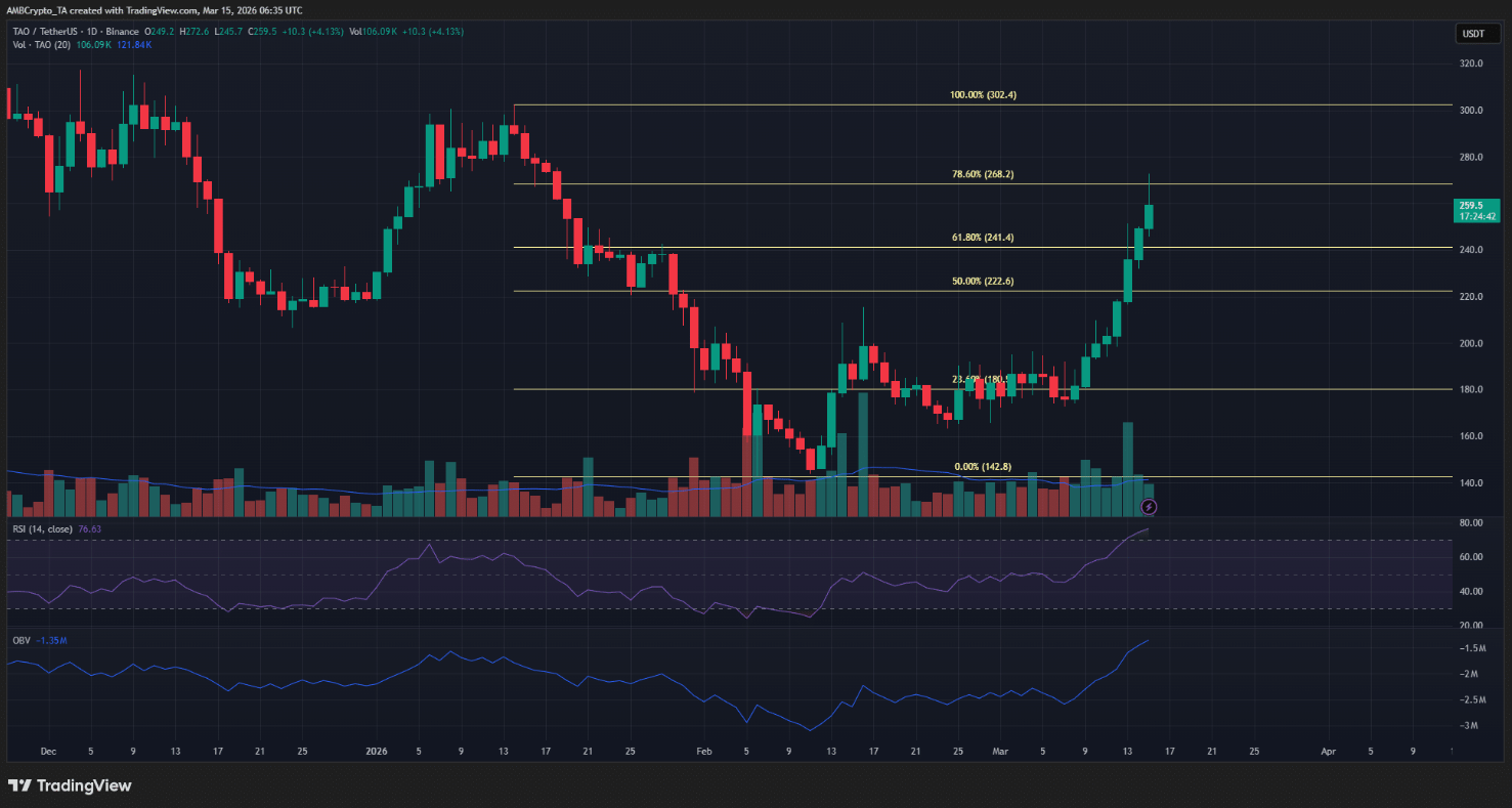 Dù vậy, nhà đầu tư cân nhắc mua TAO vẫn nên giữ sự thận trọng. Token AI này vẫn nằm trong cấu trúc giảm ở khung trung hạn, và vùng giá 268 USD hiện trùng với mức Fibonacci thoái lui 78,6%. Nếu lực mua suy yếu, khả năng TAO bị từ chối tại vùng kháng cự này và bước vào nhịp điều chỉnh ngắn hạn trong vài ngày tới là kịch bản cần được tính đến.