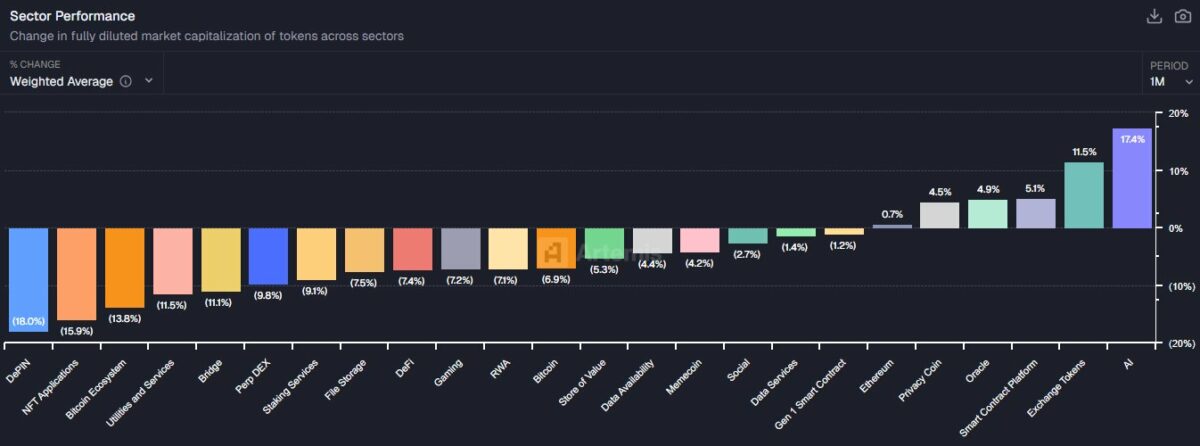Trên biểu đồ bên dưới, chúng ta có thể thấy rằng trong tháng trước, lĩnh vực AI crypto đã giành lại vị trí dẫn đầu với mức tăng 17,4%, trong khi token sàn giao dịch đứng thứ hai với 11,5%. Điều này cho thấy niềm tin đang quay trở lại với lĩnh vực AI.