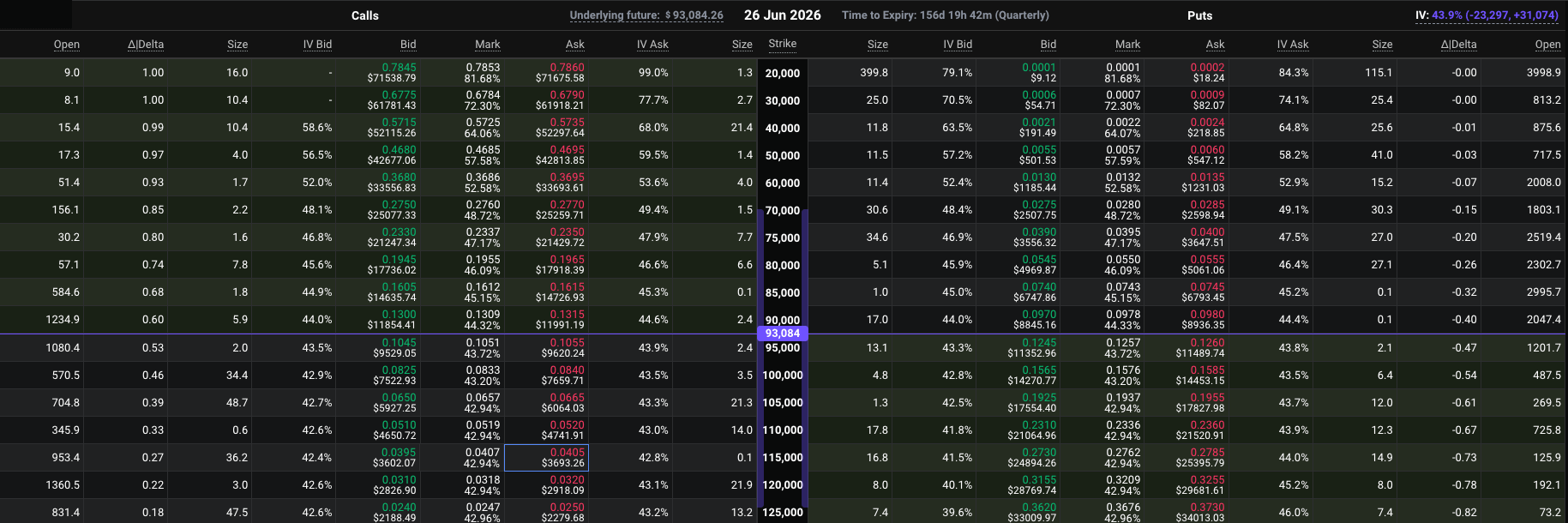 Điểm tham chiếu quan trọng nhất trong chuỗi quyền chọn là vùng at-the-money, nơi neo cách tính xác suất và payoff. Trong dữ liệu Deribit, strike có delta trung tính nhất nằm quanh 95.000 USD, với call 95.000 USD có delta nhỉnh hơn 0,52 và put tương ứng ngay dưới -0,48.