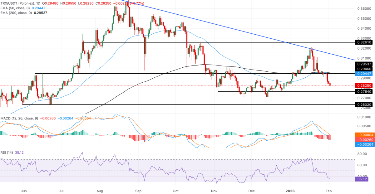 Tại thời điểm ghi nhận vào ngày thứ Hai, TRX đang giao dịch dưới ngưỡng 0,2900 USD, nối dài đà suy yếu khi tiếp tục trượt xuống dưới hai đường trung bình động hàm mũ quan trọng: EMA 50 ngày tại 0,2945 USD và EMA 200 ngày tại 0,2954 USD. Diễn biến này cho thấy xu hướng giảm đang được củng cố rõ rệt trên khung thời gian trung hạn.