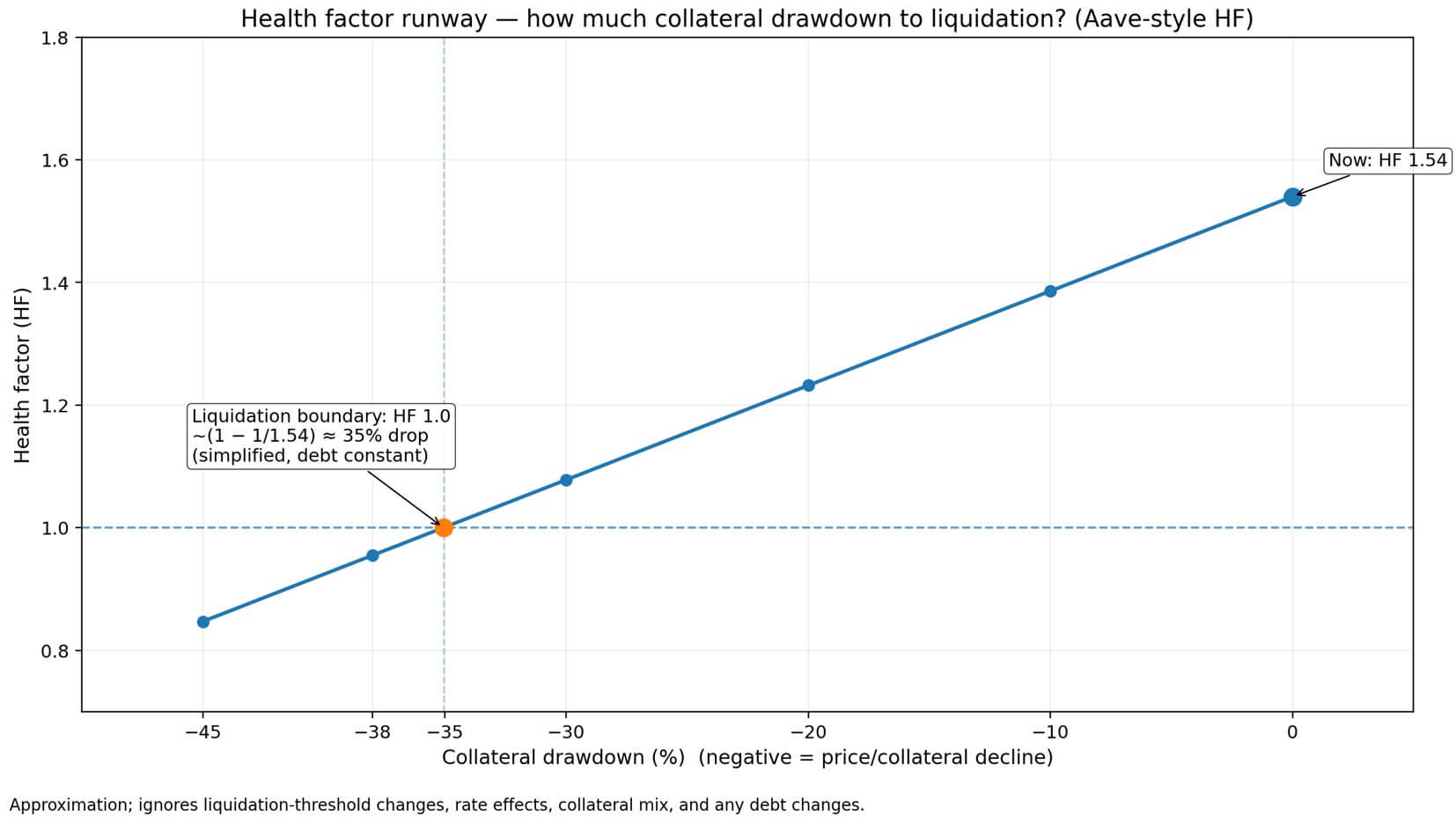 Tuy nhiên, hệ số health factor hiện ở mức 1,54 – cao hơn đáng kể so với ngưỡng thanh lý 1,0 của Aave. Điều này cho thấy vị thế vẫn còn “dư địa an toàn”, nhưng không thực sự thoải mái. Chỉ cần giá trị tài sản thế chấp giảm khoảng 38%, quá trình thanh lý sẽ được kích hoạt.
