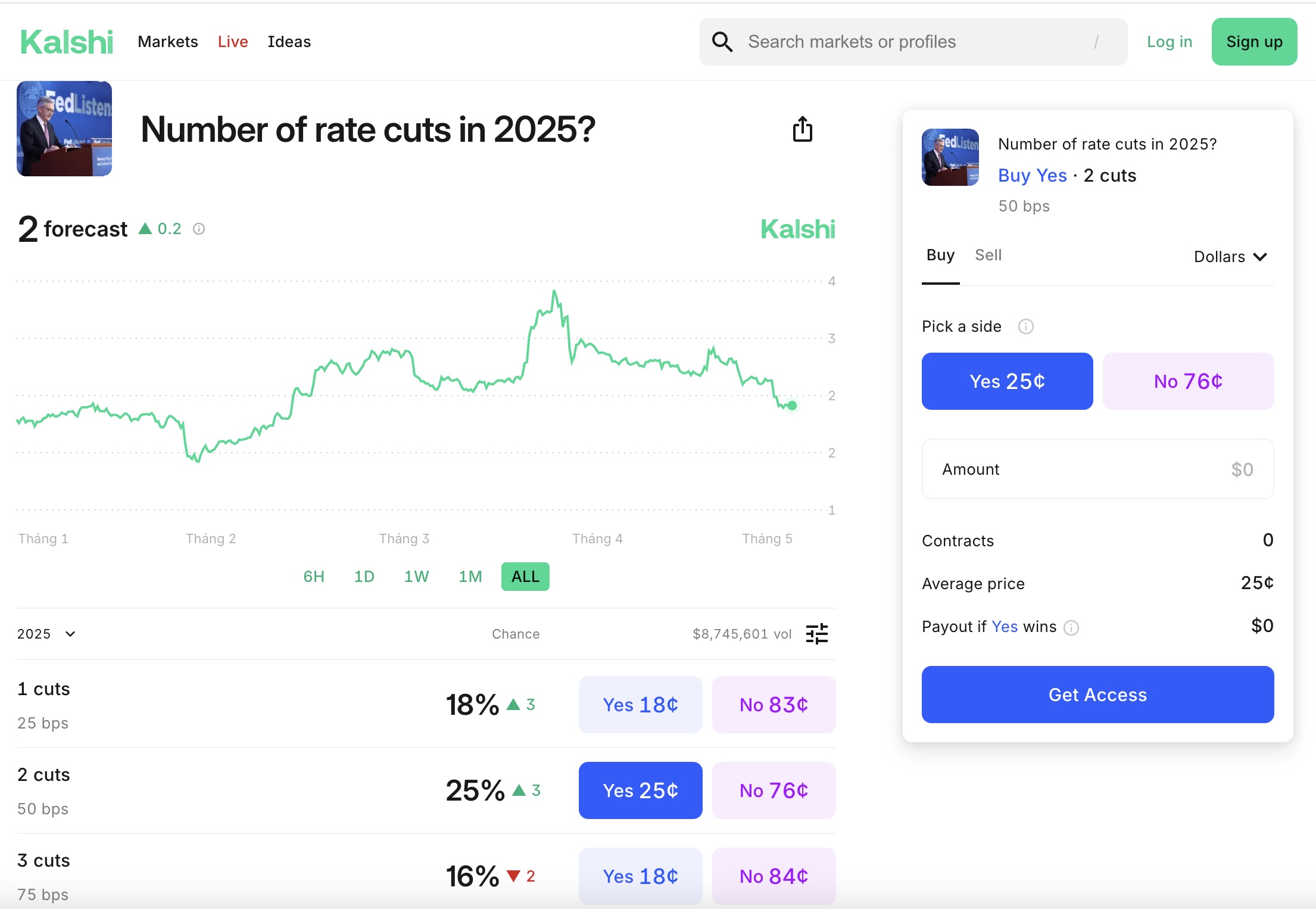 Thực tế đã cho thấy CME đúng. Kalshi kể từ đó cũng điều chỉnh lại kỳ vọng của mình, hiện chỉ dự đoán còn hai lần giảm lãi suất trong phần còn lại của năm – sát hơn với dự báo chung của thị trường tài chính truyền thống.