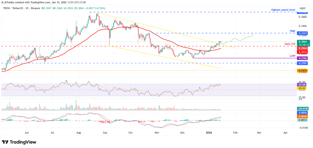 Trong kịch bản tích cực, nếu lực mua tiếp tục được duy trì, đà tăng của TRX có thể được mở rộng, hướng tới vùng kháng cự tại đỉnh ngày 22/10 quanh mốc 0,32 USD.