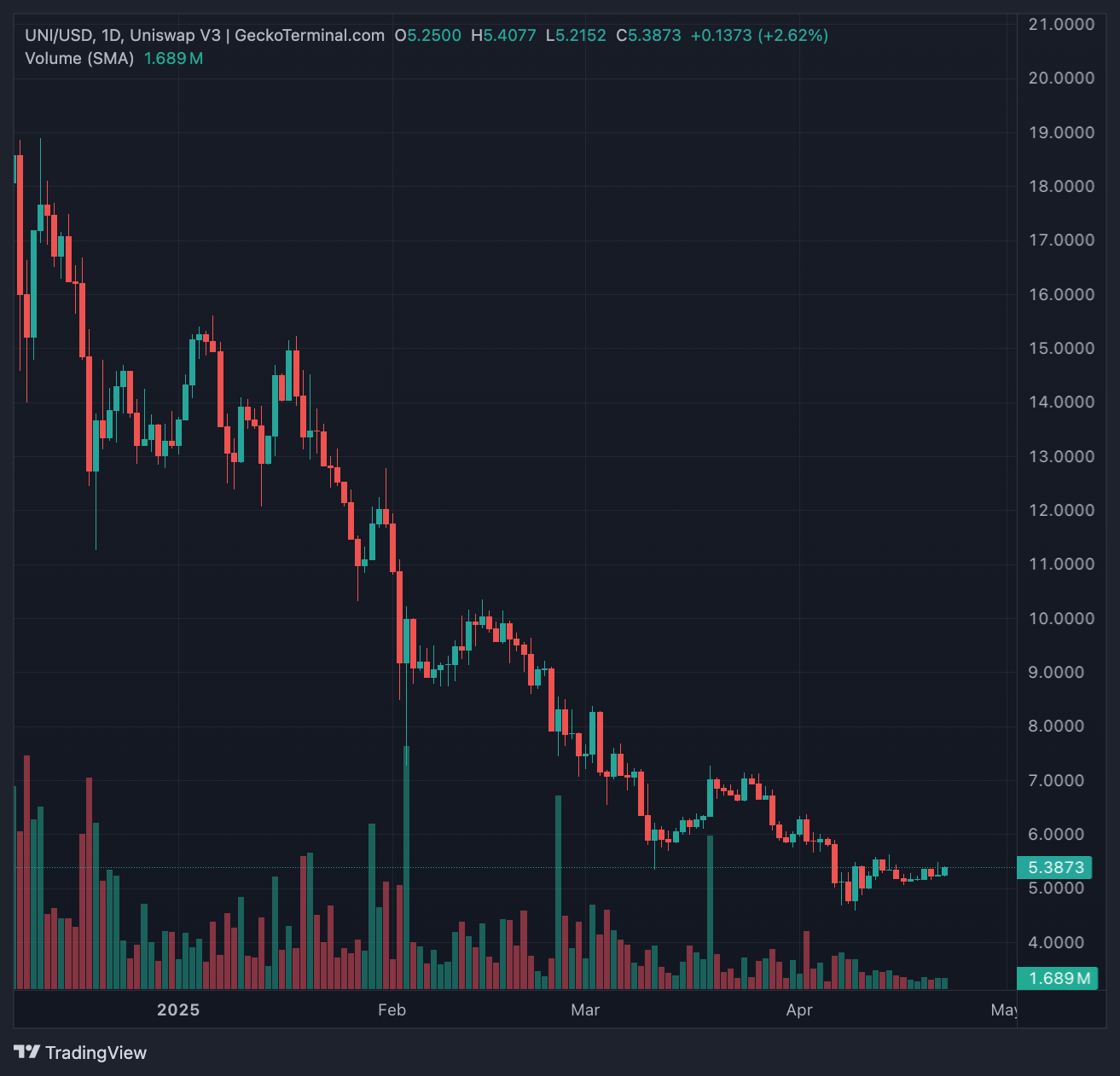 Giá token UNI hiện giao dịch quanh mức 5,37 USD, với vốn hóa thị trường đạt 3,2 tỷ USD, chiếm khoảng 0,12% thị phần. Tuy nhiên, bất chấp mức TVL ấn tượng, giá UNI đã giảm hơn 1% trong 24 giờ qua, nối dài xu hướng giảm kéo dài suốt ba tháng gần đây.