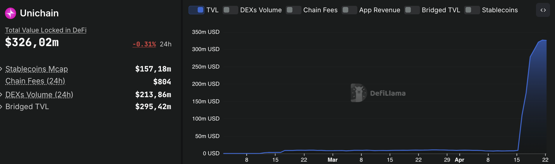 Theo dữ liệu mới nhất từ DefiLlama, tính đến ngày 22 tháng 4 năm 2025, Unichain – nền tảng Layer-2 mới được ra mắt bởi Uniswap – đã ghi nhận tổng giá trị bị khóa (TVL) là 326 triệu USD. Con số ấn tượng này phản ánh vai trò ngày càng quan trọng của Unichain trong việc thúc đẩy sự phát triển của lĩnh vực tài chính phi tập trung (DeFi), đặc biệt thông qua việc tối ưu hóa hiệu quả mạng lưới và cải thiện khả năng quản lý thanh khoản.