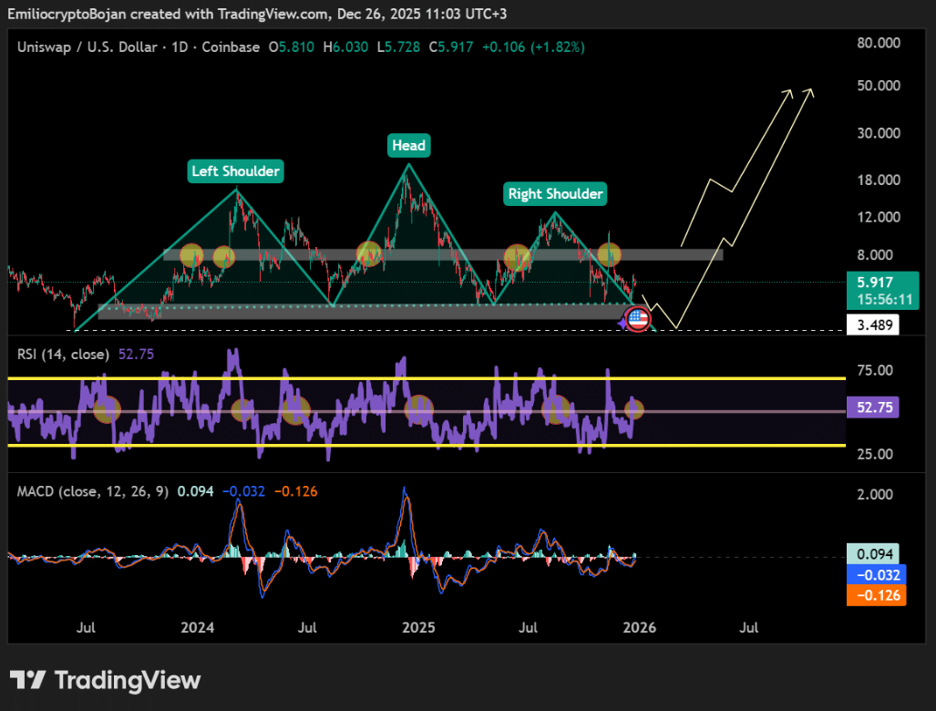 Kể từ đáy hình thành vào tháng 6/2023, UNI đã mất gần hai năm để hoàn thiện mô hình vai đầu vai nghịch — một cấu trúc kỹ thuật thường báo hiệu sự đảo chiều xu hướng trong trung hạn. Trong quá khứ, mỗi lần giá bứt phá thành công lên trên vùng 8,4 USD đều kích hoạt các nhịp tăng đáng kể. Tuy nhiên, những nỗ lực vượt cản gần đây liên tục thất bại, cho thấy lực mua đang suy giảm rõ rệt.