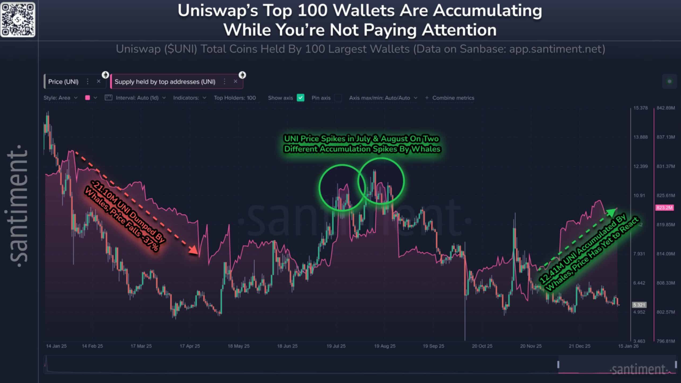 Trong một bài đăng trên nền tảng X, công ty phân tích dữ liệu tiền điện tử Santiment cho biết 100 ví lớn nhất trên mạng lưới đang âm thầm gia tăng lượng nắm giữ UNI. Chỉ trong vòng 8 tuần gần đây, nhóm ví này đã mua thêm tổng cộng khoảng 12,41 triệu token UNI.