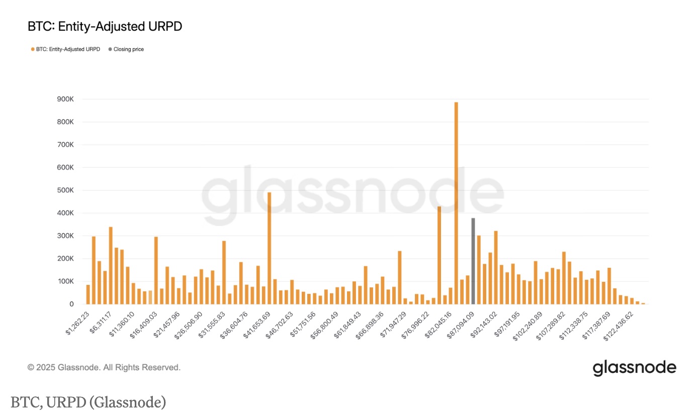 Quan sát này được củng cố bởi dữ liệu từ Glassnode. Chỉ số UTXO Realized Price Distribution (URPD) cho thấy nơi mà nguồn cung Bitcoin hiện tại từng được di chuyển, sử dụng khung điều chỉnh theo từng thực thể, gán toàn bộ số dư của mỗi thực thể vào giá trung bình mua vào của họ.