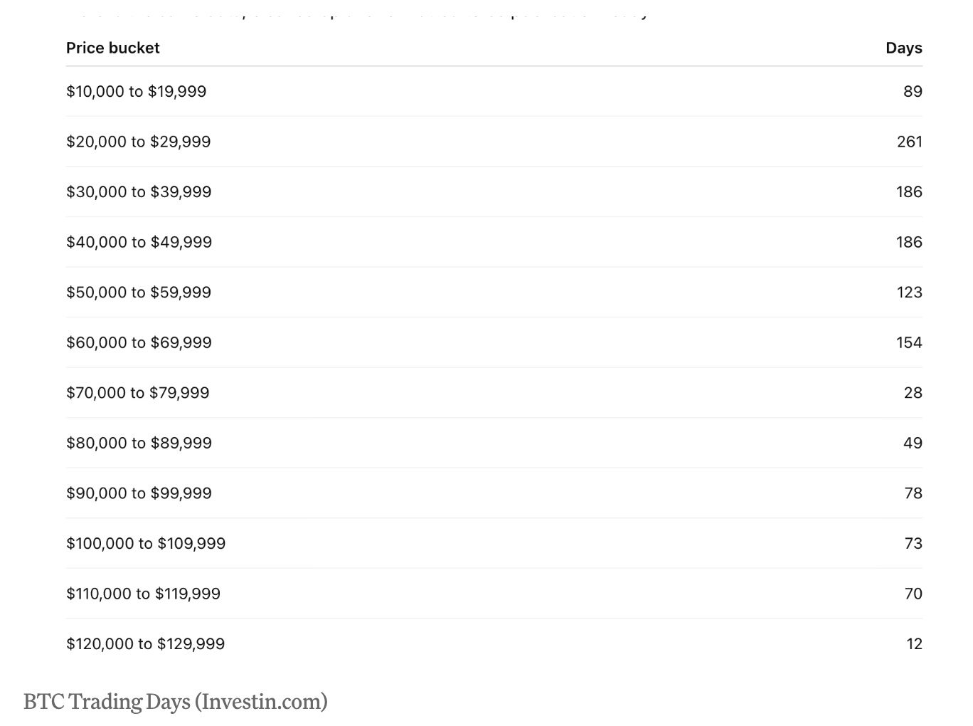 Dữ liệu từ Investing.com cho thấy sự khác biệt rõ rệt giữa các vùng giá. Loại trừ quãng thời gian rất ngắn khi Bitcoin lập đỉnh kỷ lục trên 120.000 USD, BTC dành ít thời gian nhất trong vùng 70.000 – 79.999 USD, chỉ 28 ngày giao dịch. Thêm vào đó, nó chỉ dành 49 ngày trong khoảng 80.000 – 89.999 USD. Ngược lại, các vùng giá thấp hơn như 30.000 – 39.999 USD hay 40.000 – 49.999 USD chứng kiến gần 200 ngày giao dịch, cho thấy những mức này đã được kiểm nghiệm và củng cố rất nhiều.