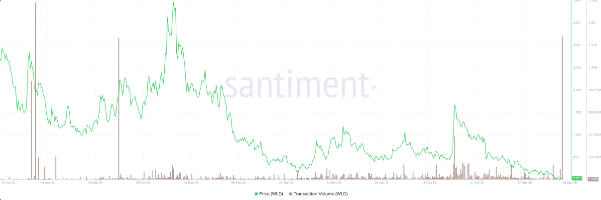 Dữ liệu từ Santiment cho thấy hệ sinh thái WLD đang chứng kiến sự bùng nổ mạnh mẽ về hoạt động giao dịch. Cụ thể, tổng khối lượng giao dịch on-chain của WLD đã vọt lên 1,46 tỷ USD vào ngày thứ Tư — mức cao nhất kể từ đầu năm và cũng là ngưỡng chưa từng ghi nhận kể từ tháng 7/2024. Đà gia tăng đột biến này phản ánh rõ rệt sự cải thiện mạnh mẽ về mức độ quan tâm của giới giao dịch cũng như thanh khoản thị trường, qua đó củng cố thêm cho kỳ vọng xu hướng tăng giá của Worldcoin trong ngắn hạn.