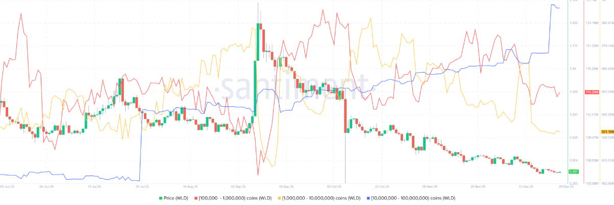 Song song với đó, dữ liệu Supply Distribution từ Santiment cho thấy tín hiệu tích cực từ nhóm nhà đầu tư lớn. Trong giai đoạn giá điều chỉnh gần đây, một bộ phận cá voi đã tranh thủ gom mua WLD.