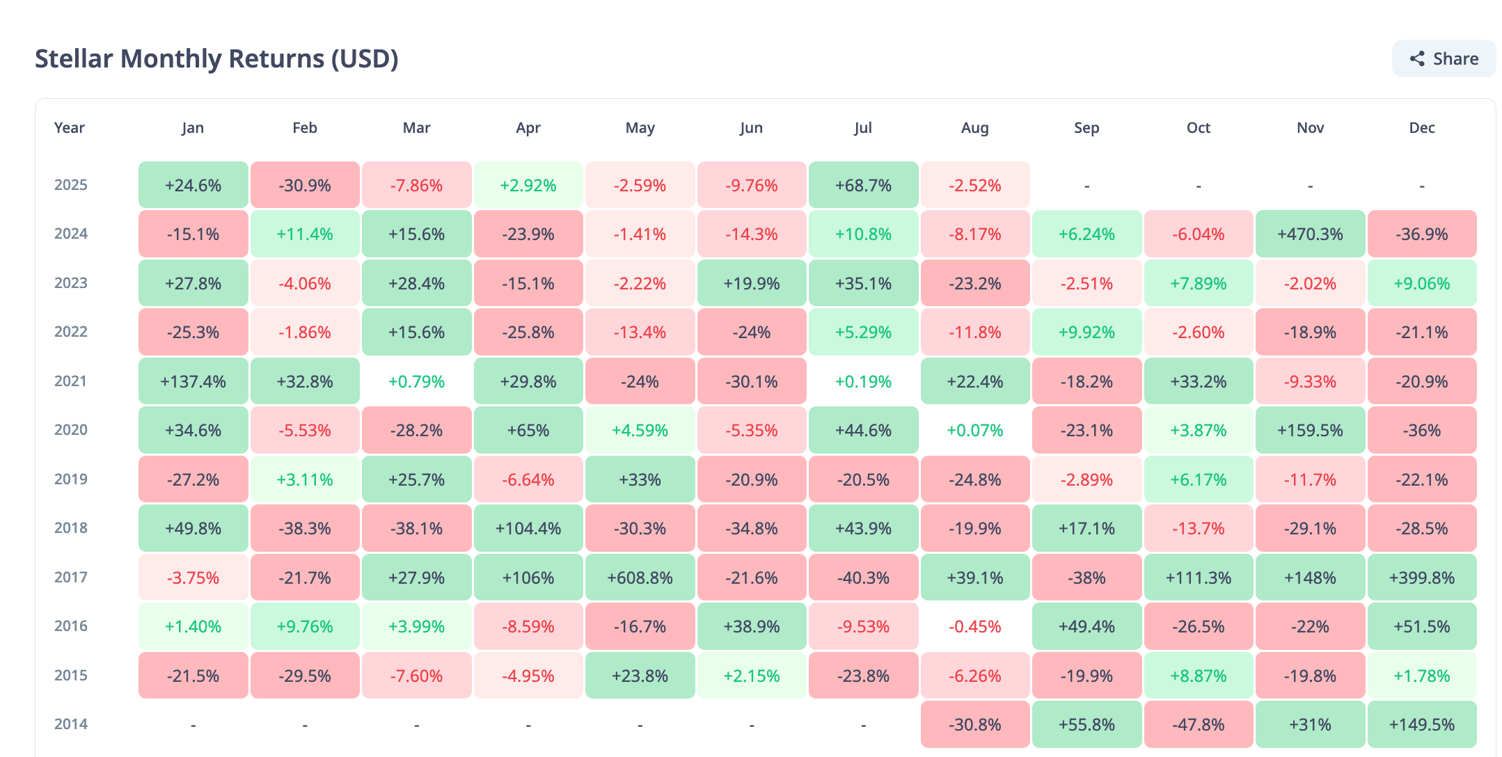 Phân tích lợi nhuận hàng tháng của XLM cho thấy mô hình đáng lo ngại: Tháng 8 chỉ mang lại mức đóng tích cực hai lần – vào các năm 2017 và 2021. Tất cả các tháng 8 còn lại đều kết thúc trong sắc đỏ.
