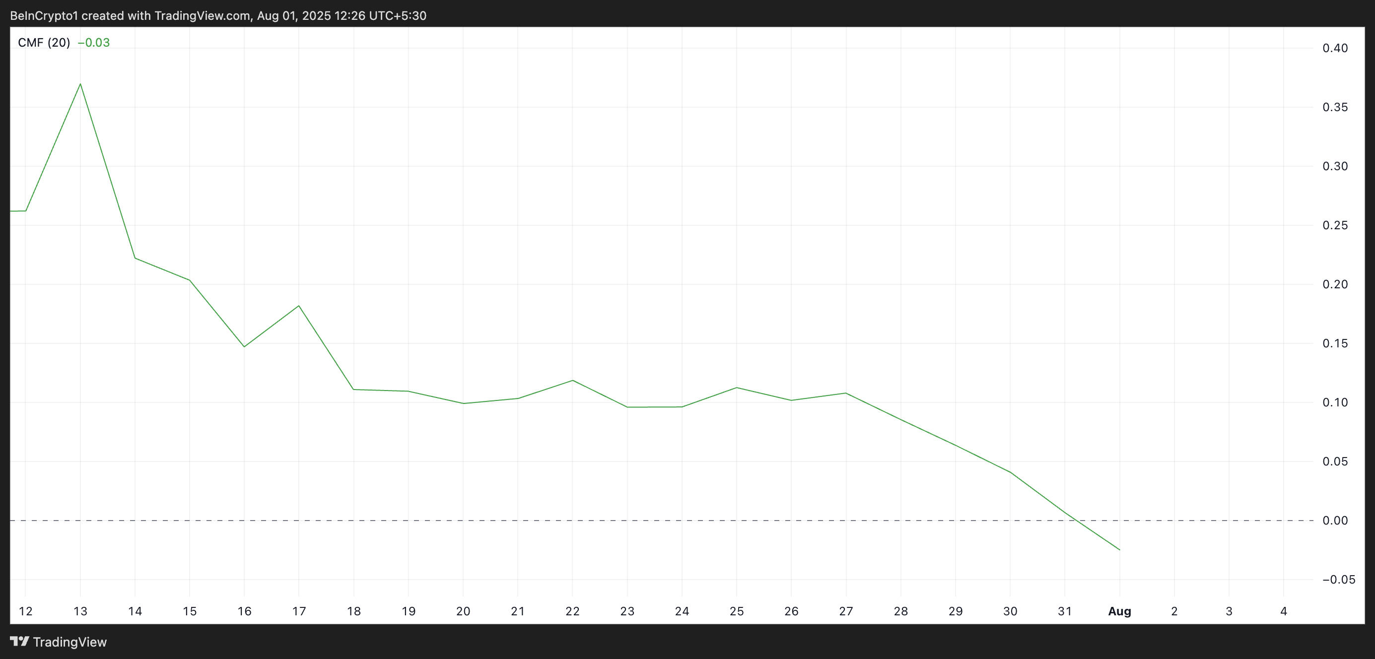 Củng cố cho triển vọng giảm giá, chỉ báo Chaikin Money Flow (CMF) của XLM hiện đã trượt xuống dưới ngưỡng 0 – một tín hiệu thận trọng khác cho thấy nguy cơ đà giảm sẽ kéo dài trong tháng 8 này. Chỉ số CMF hiện đang ở mức -0,03 tại thời điểm viết bài, tức là đang có dòng vốn rút ròng khỏi thị trường giao ngay của XLM.