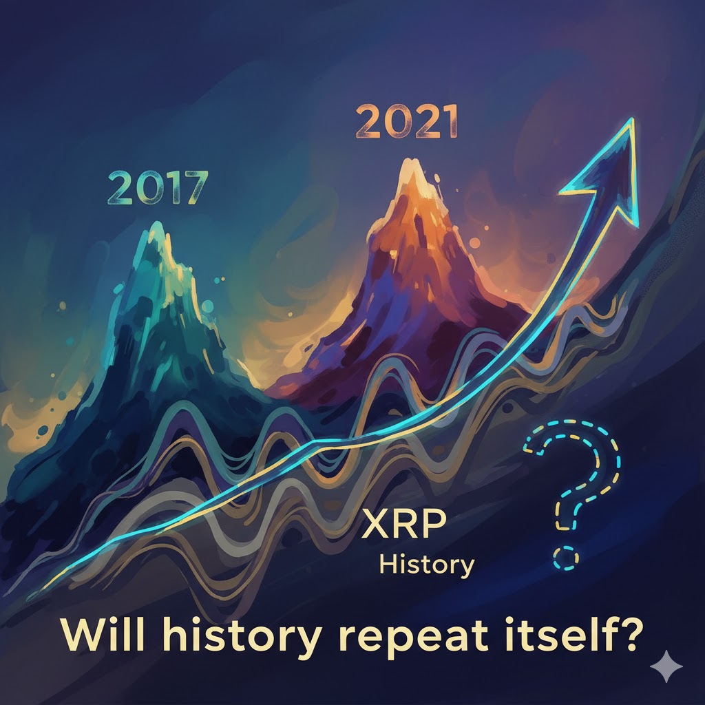 Điều đang thu hút sự chú ý của các trader hiện nay là nhịp điệu quen thuộc đang hình thành trên biểu đồ hàng tuần — những dấu hiệu tương tự như các chu kỳ bùng nổ của XRP vào năm 2017 và 2021.