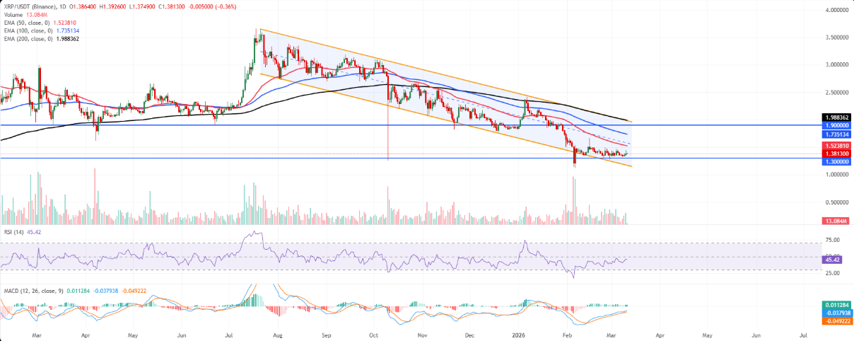 Ở chiều ngược lại, kháng cự trước mắt nằm tại 1,43 USD, tiếp theo là đường EMA 50 ngày quanh 1,52 USD và đường giữa của kênh giảm gần 1,60 USD. Chỉ khi phá vỡ và duy trì trên các mốc này, XRP mới có cơ hội làm suy yếu cấu trúc giảm giá và mở đường cho một đợt kiểm tra vùng kháng cự mạnh hơn gần 1,90 USD tại biên trên của kênh.