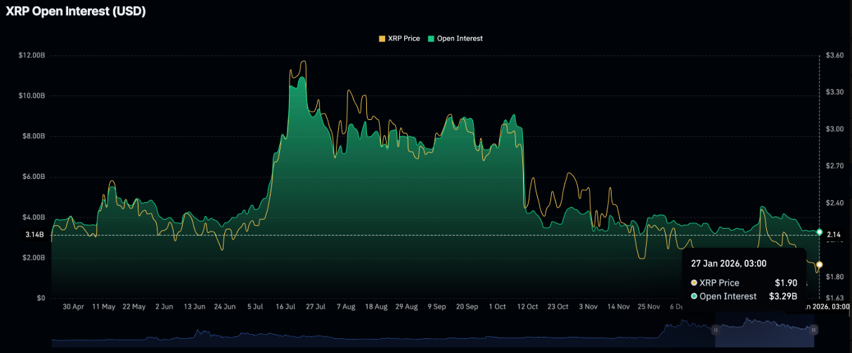OI đại diện cho tổng giá trị danh nghĩa của các hợp đồng tương lai đang lưu hành. Việc chỉ số này suy giảm cho thấy niềm tin của giới đầu tư đối với XRP đang yếu đi, kéo theo động lực tăng giá bị bào mòn khi các trader có xu hướng đóng vị thế thay vì mở mới.