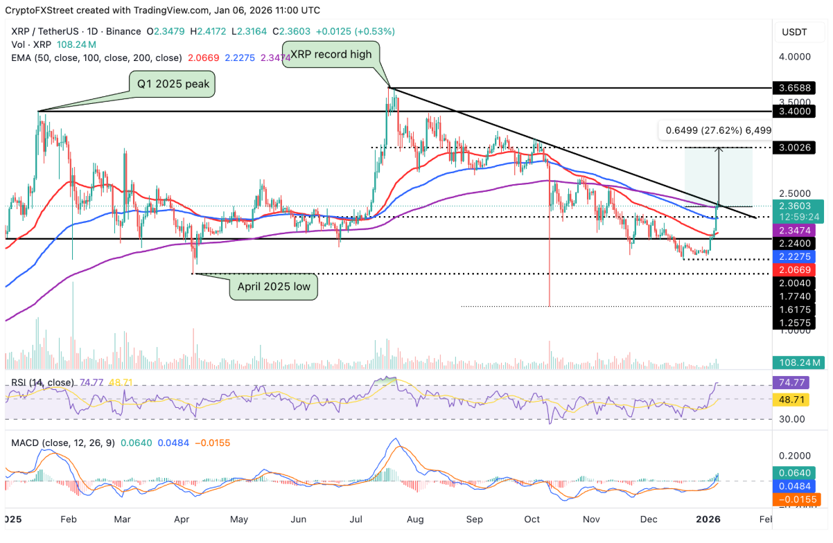 Trong trường hợp XRP đóng cửa thuyết phục trên đường EMA 200 ngày, đồng thời bứt phá đường xu hướng giảm dài hạn, giá có khả năng mở rộng nhịp tăng hướng tới mốc tâm lý quan trọng 3,00 USD — tương đương mức tăng xấp xỉ 28% so với vùng giá hiện tại.