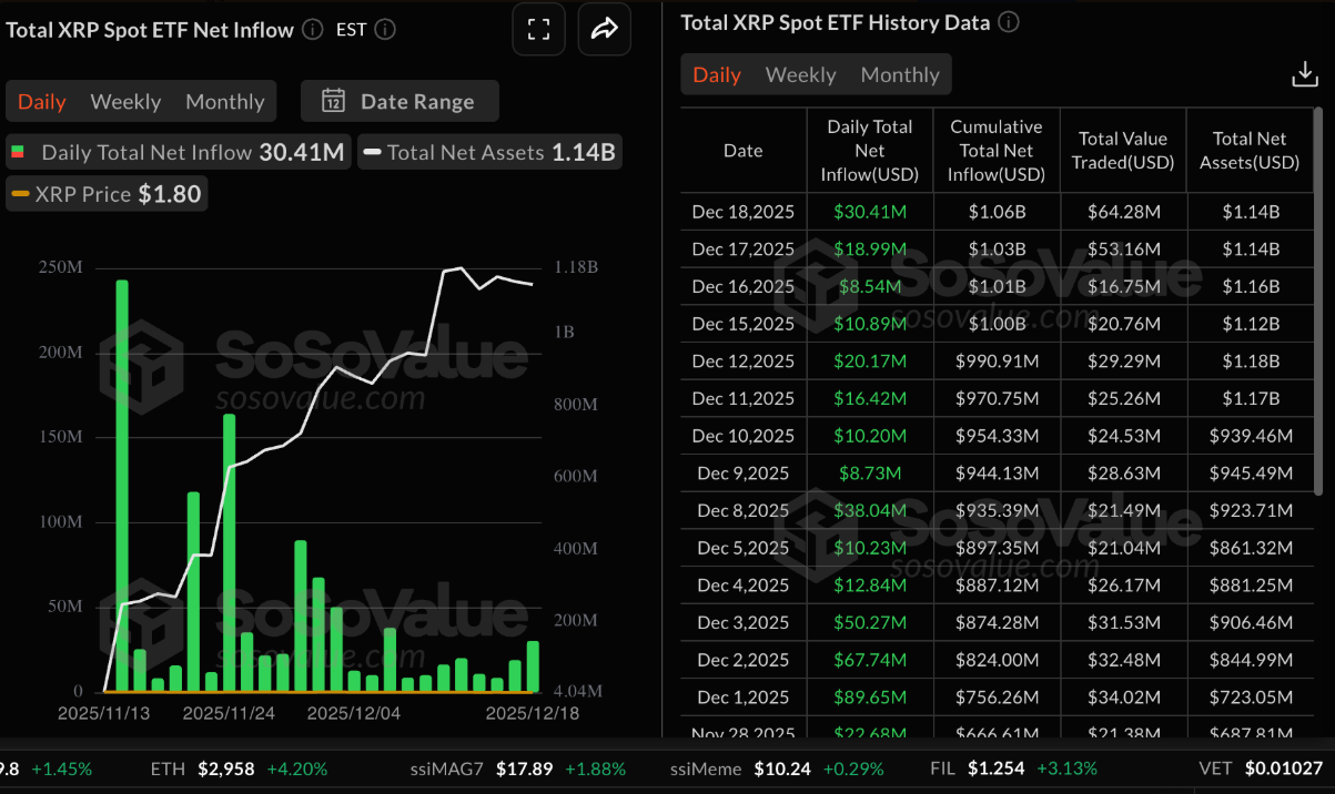 Theo số liệu từ SoSoValue, tổng dòng tiền tích lũy vào các ETF XRP hiện đã đạt 1,06 tỷ USD, trong khi giá trị tài sản ròng (AUM) trung bình duy trì ở mức 1,14 tỷ USD. Đáng chú ý, kể từ khi chính thức ra mắt vào tháng 11, các ETF XRP chưa ghi nhận bất kỳ dòng vốn rút ra nào, phản ánh sự cải thiện rõ rệt trong khẩu vị rủi ro và niềm tin của giới đầu tư tổ chức.