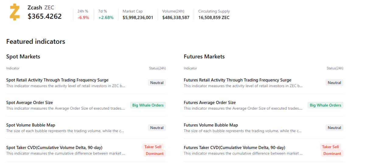 Dữ liệu tổng hợp từ CryptoQuant cho thấy tâm lý của các trader Zcash đang ở trạng thái giằng co. Dù các lệnh giao dịch quy mô lớn từ cá voi xuất hiện trên cả thị trường giao ngay lẫn hợp đồng tương lai — hàm ý sự quan tâm theo hướng tăng giá — nhưng áp lực bán gia tăng và chiếm ưu thế cho thấy lực cung vẫn ở mức cao. Sự đan xen giữa hai thái cực này phản ánh tâm lý thận trọng, do dự của nhà đầu tư, qua đó làm giảm khả năng hình thành một nhịp phục hồi mang tính bền vững.