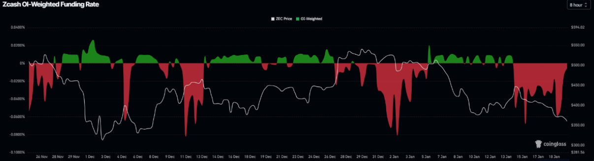 Trên thị trường phái sinh, các tín hiệu giảm giá tiếp tục được củng cố. Theo chỉ số OI-Weighted Funding Rate từ Coinglass, số lượng trader đặt cược vào kịch bản giá Zcash đi xuống hiện vượt trội so với những người kỳ vọng xu hướng tăng. Funding rate đã chuyển sang vùng âm và giảm xuống mức -0,0057% vào thứ Ba, cho thấy các vị thế bán (Short) đang chi trả phí cho các vị thế mua (Long) — một dấu hiệu điển hình của tâm lý bi quan đang chi phối thị trường ZEC.